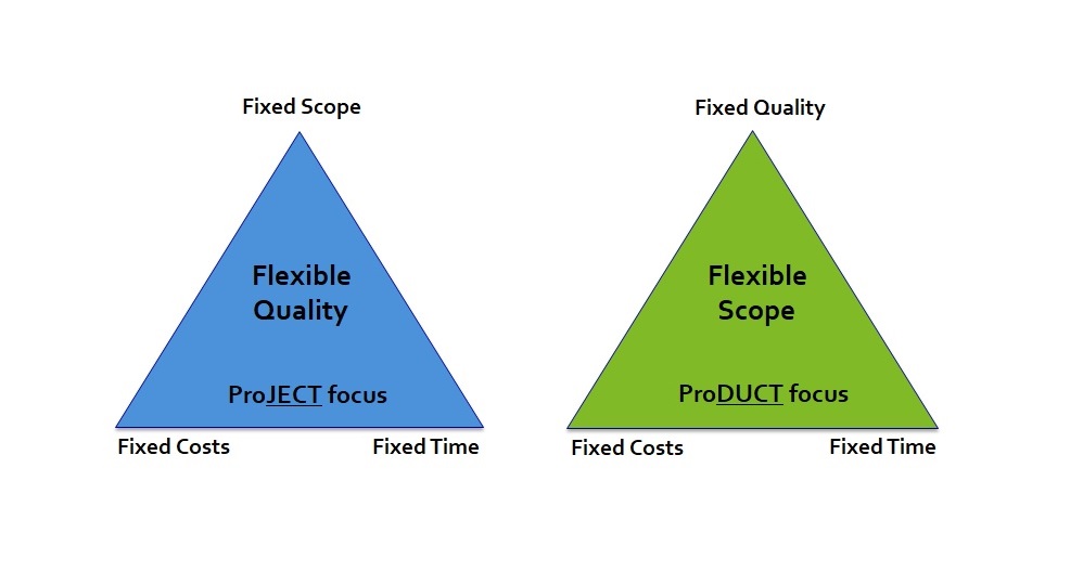 During trainings about Agile and Scrum I often use this image with the two triangles to compare two different mindsets with which projects can be approached; the Project Mindset and the Product Mindset.